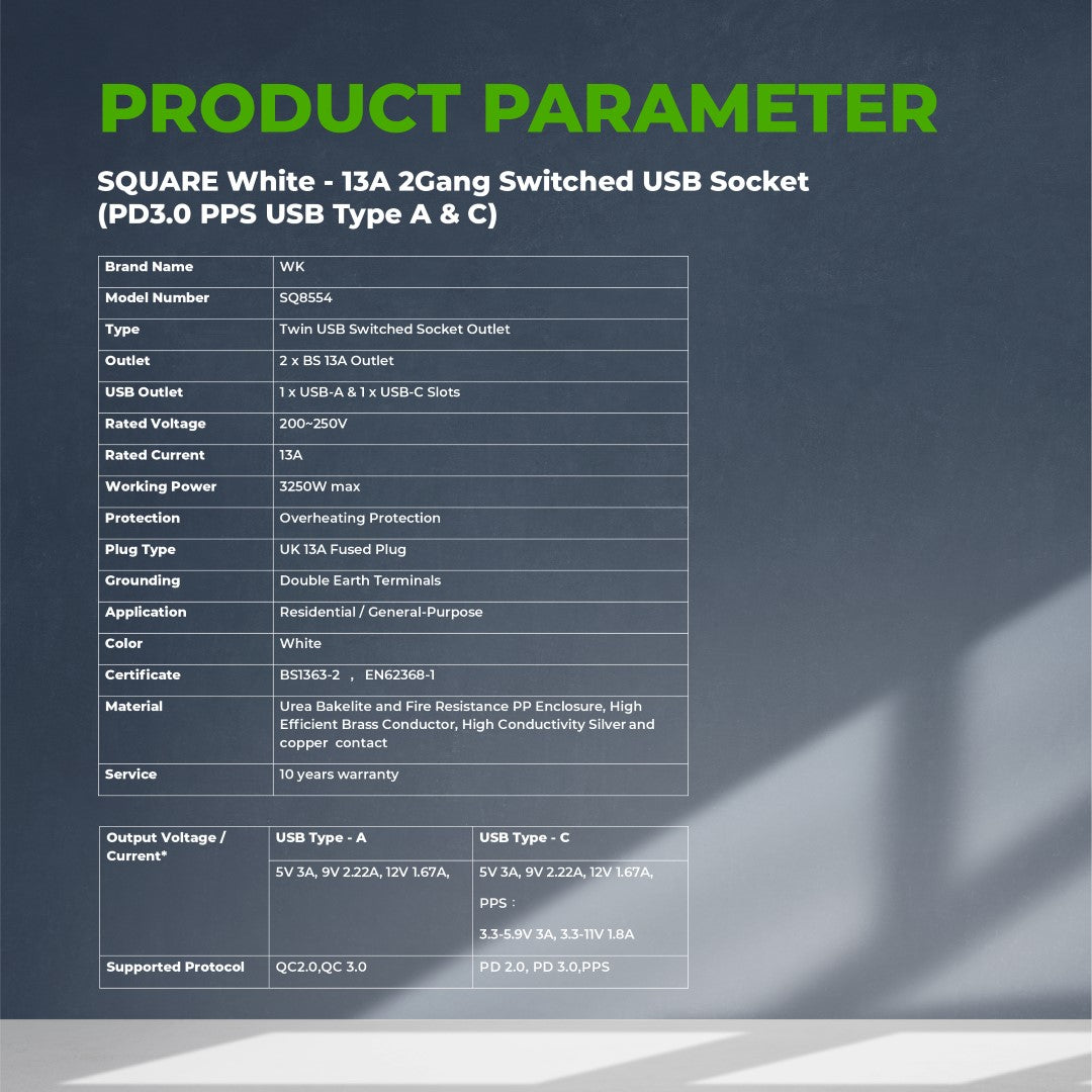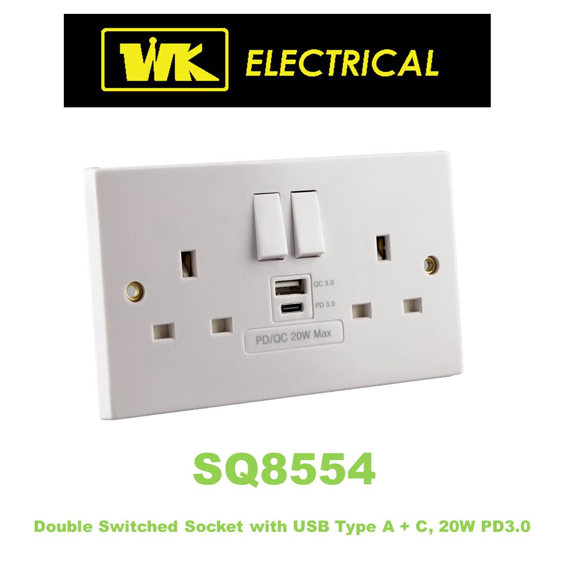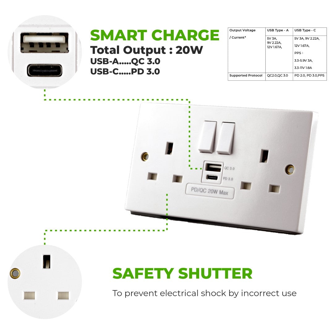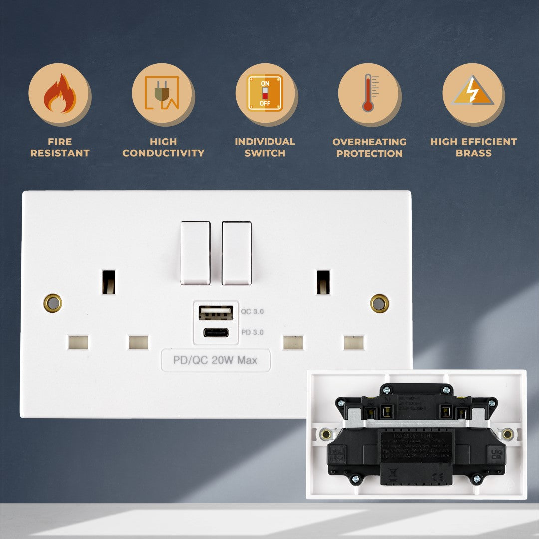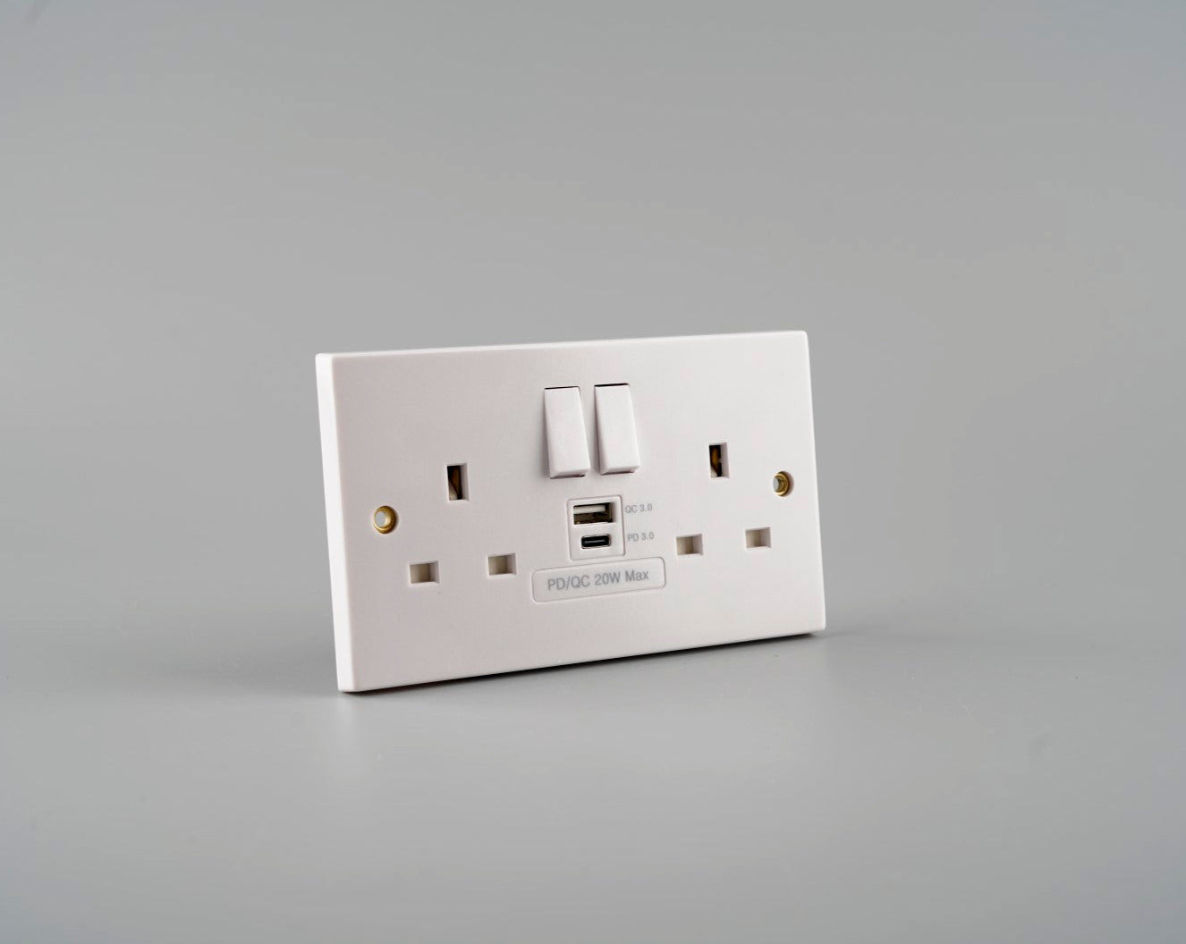 13A 2Gang Switched Socket with USB Type A and Type C (PD3.0 20W)