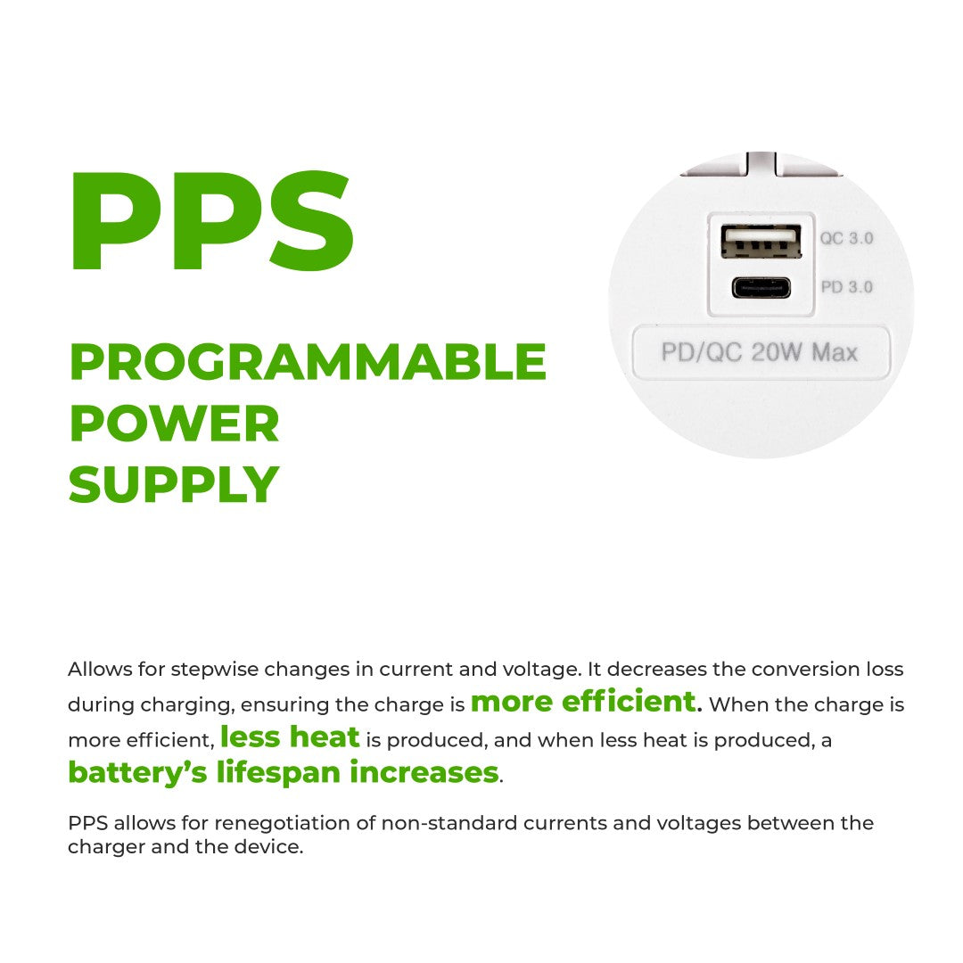 - PD3.0 with PPS function: This smart charge wall socket support QC2.0, QC3.0, PD2.0 and PD 3.0 protocol. Also allows for renegotiation of non-standard currents and voltages between charger and devices.