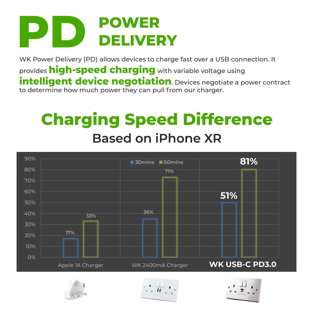 - Quick Charge: WK Power Delivery (PD) allows devices to charge fast over a USB connection. It provides HIGH-SPEED charging with variable voltage using Intelligent Device Negotiation.