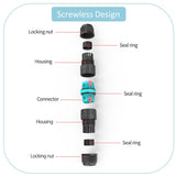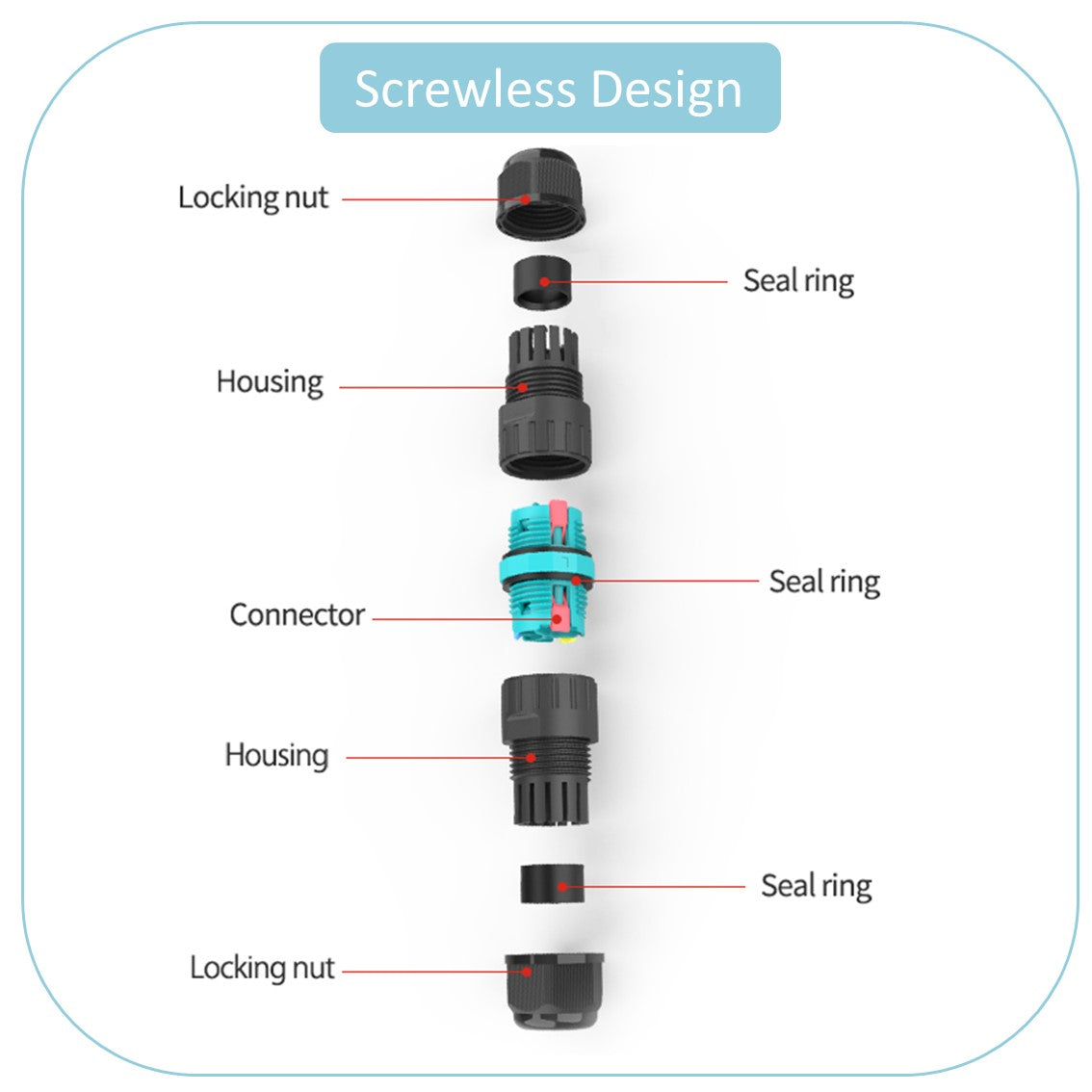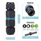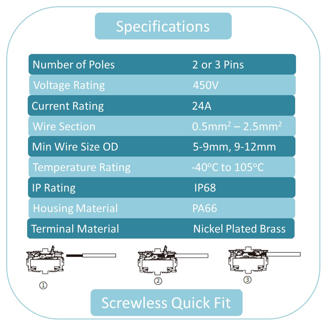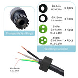IP68 Waterproof - Electric Connectors come with difference sizes of Seal Rings, suitable for cable Ø5-9mm (0.2-0.35in), Ø9-12mm (0.35-0.48in), 2 cores x Ø3-4.5mm (0.12-0.18in), 3 cores x Ø3-4.3mm (0.12-0.17in)